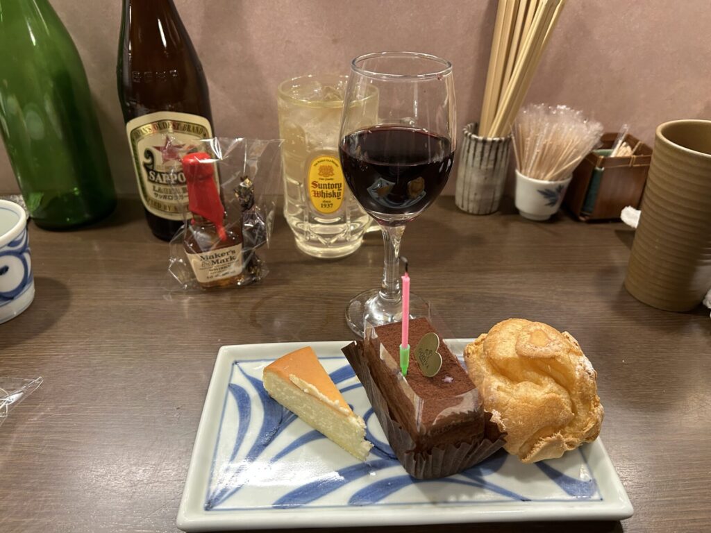 那須の御用邸のチーズケーキ、GODIVAのチョコレートケーキ、そして私のビアードパパのシュークリームと、おっさん3人、3様のスイーツを披露。そしてお店の方が、お誕生日ケーキ用のローソクと赤ワインまで用意していただき、皆んなでハッピバースデーの合唱です。 まさかこんな素敵なお誕生会になるとは、、、、。 お店の方も、居合わせた常連さんも、そして誕生日を迎えた3人のおっさんも、みんな幸せそうな笑顔が溢れていました。