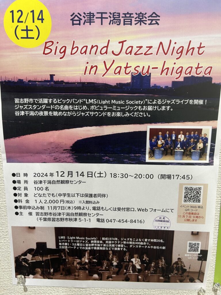 いよいよあと2週間となりました。私が所属するジャズビックバンドの演奏会が12月14日(土)谷津干潟自然観察センターで夕方6時半から開催されます。気合い入れて今日も練習します。夜の谷津干潟でクリスマスソングを交えたジャズ、そのような演奏会になるか楽しみです。お時間のある方、如何ですか。