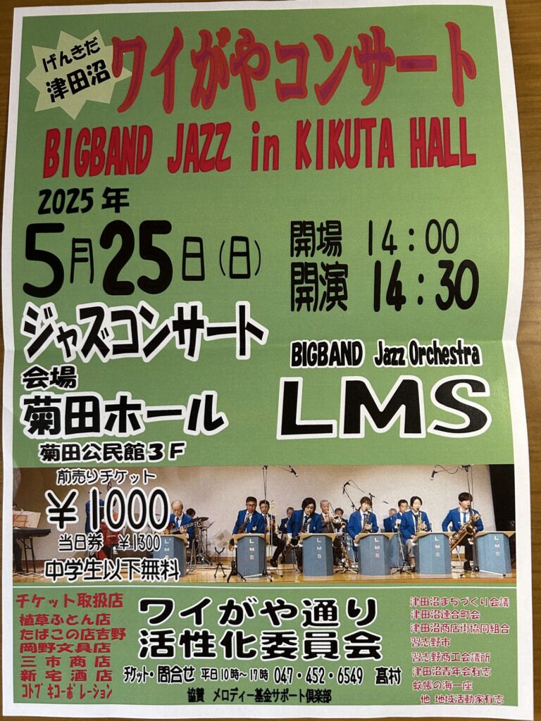 あっ、5月25日(日)の習志野市菊田公民館での演奏会のチケットができました。 お近くの方で興味のある方は、ご連絡ください。一緒にスィングして音楽でリフレッシュしませんか。